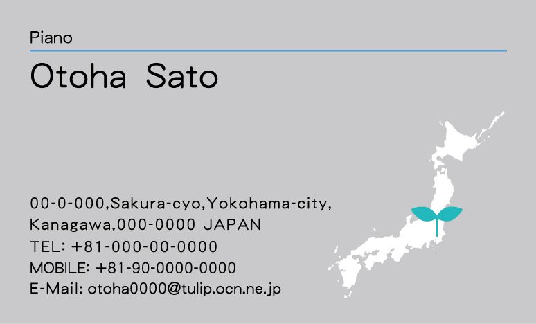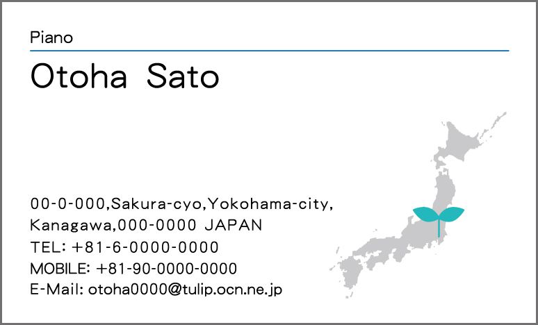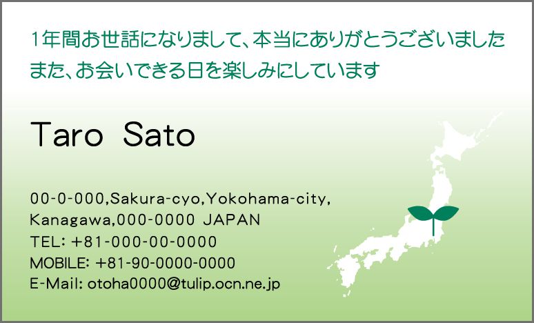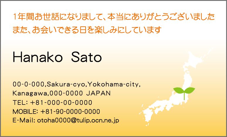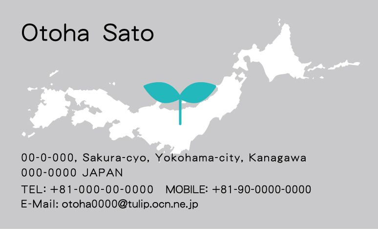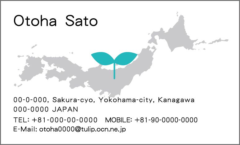 外国の方に名刺を渡す時、「私は、日本の○○県に住んでいます」と日本地図で説明できたら楽しいですよね。お住まいの都道府県に合せて、双葉の位置を無料で変えられますので、お気軽にお申し付けください。