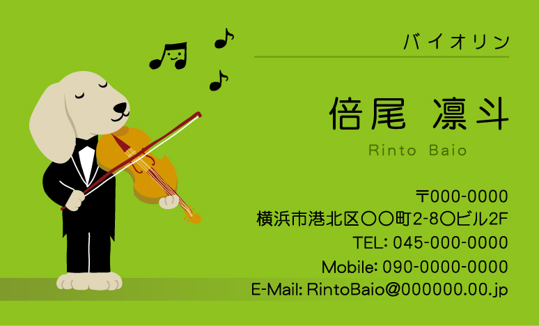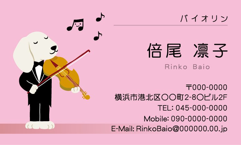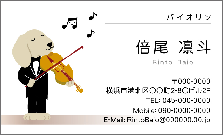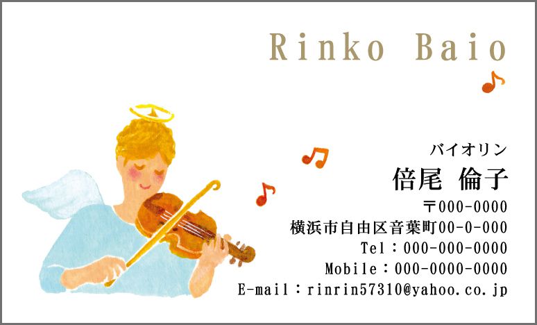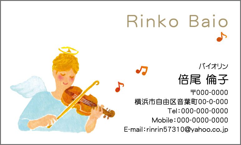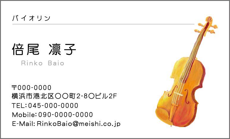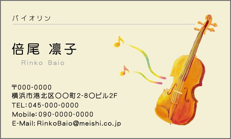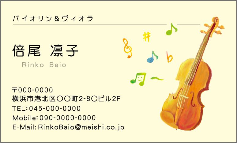 バイオリニストの方や、バイオリンが趣味の方に使っていただきたいバイオリンと音符のデザイン名刺です。