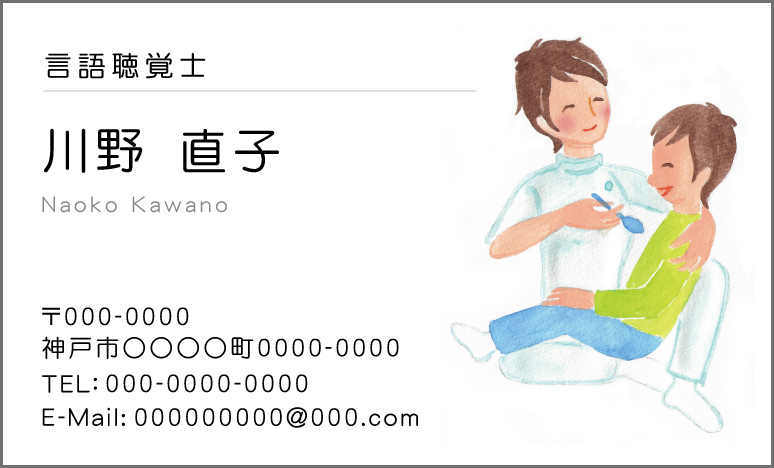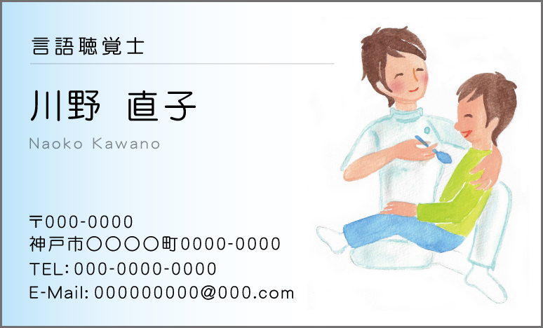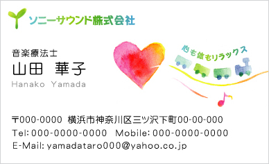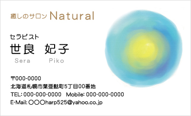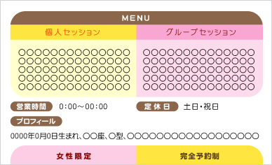 お仕事内容や施術内容、営業時間や定休日等をわかりやすくレイアウト致します。上記はあくまでも例ですので、お客様のお仕事内容に合わせて印刷できます。申し込みフォームのその他の欄に『裏面メニュー1』 型番Z04とご記入ください。その他裏面の例→名刺裏面