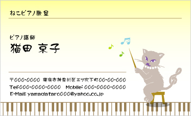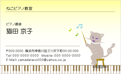 ピアノの鍵盤を下部にあしらい、 淡い黄色のグラデーションをバックに使ったネコイラスト名刺です。