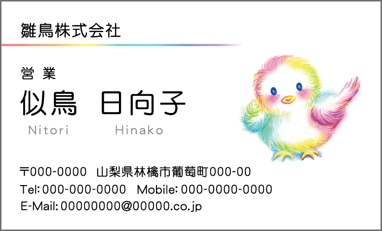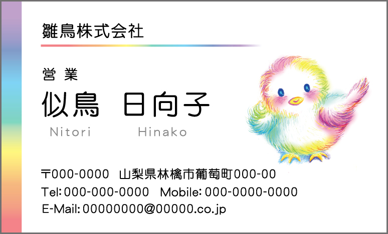 七色の産毛に包まれている、ひな鳥のイラスト名刺です。
