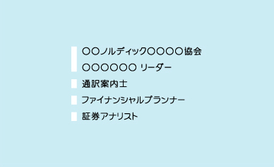 ・ノルディックウォーキング アクティビティ リーダー ・理容師 ・美容師 ・コンサルタント ・経営コンサルタント ・セラピスト ・会社経営 ・英会話の先生 ・イタリア語の先生 ・フランス語の先生 ・ゴルファー