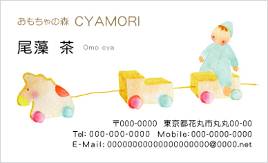 木のおもちゃ(馬・電車)と人形のイラスト名刺です。