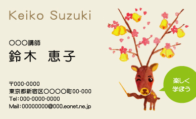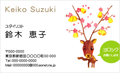 鈴の木が角になっているシカのイラスト名刺です。滋賀県(シガケン)の方、志賀高原、シカゴ出身の方、作詞家の方、視覚に関するご職業の方、何かの資格をお持ちの方にも最適。げんをかつぐなら…、あなたに「シカ」仕事を頼みません。