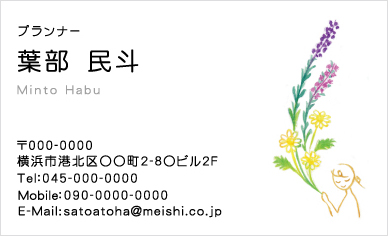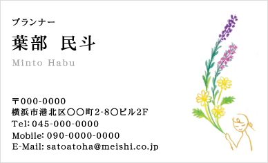 ラベンダーやカモミール、ローズマリーのハーブを持つ女性イラストの名刺です。書体は、礼儀正しい印象の明朝体を使用。