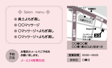 お店に足を運びやすいよう、サロンのメニューや営業時間、地図などを配置しています。※裏面もご注文の場合は、お申し込みフォームの「その他」の欄に名刺のデザインの名前と型番、裏面に載せる内容をお書きになってください。