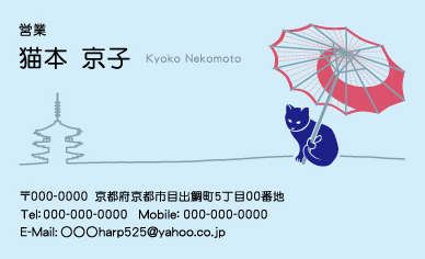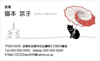しっぽでクルリと京都の傘を持って、法観寺を散歩する猫です。